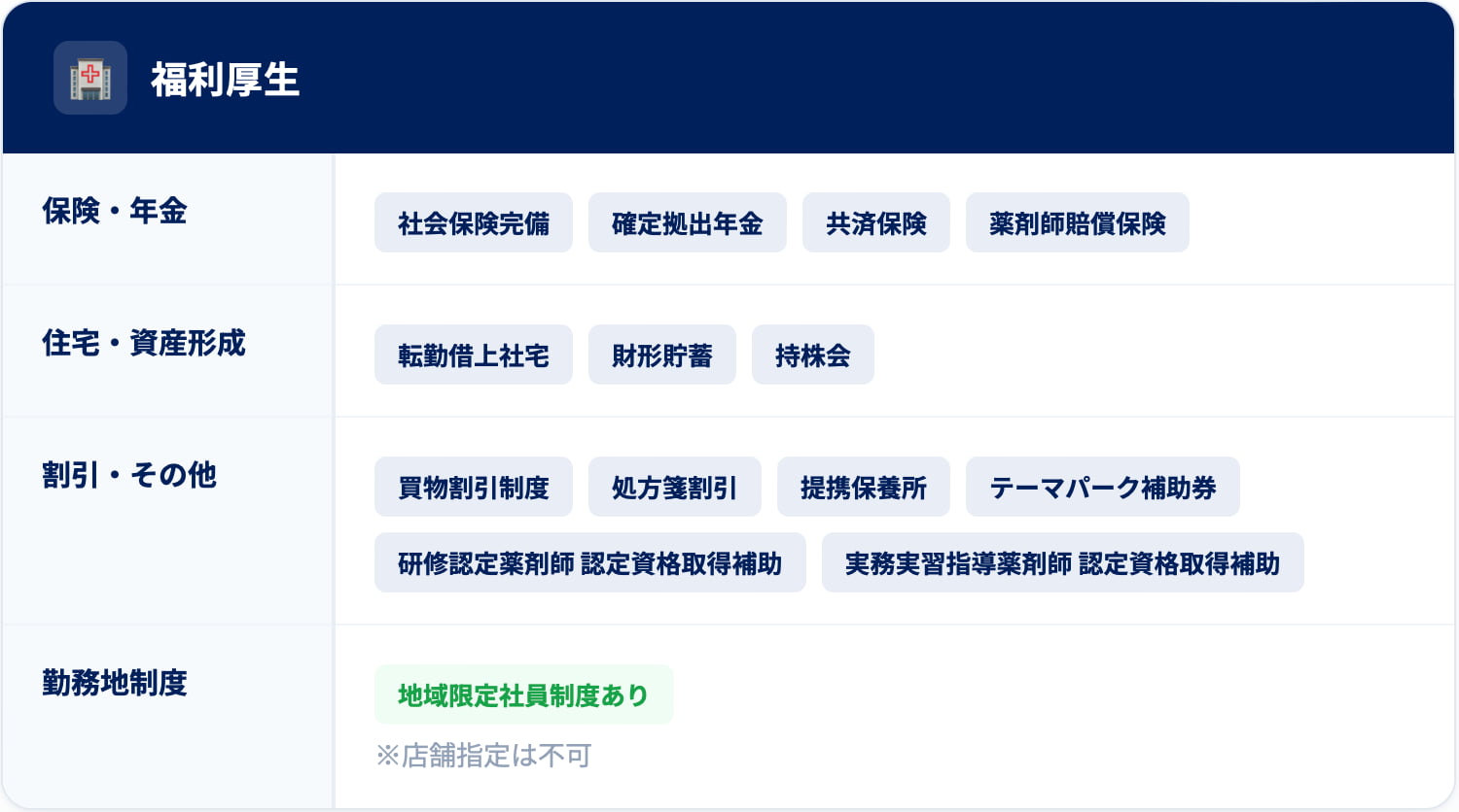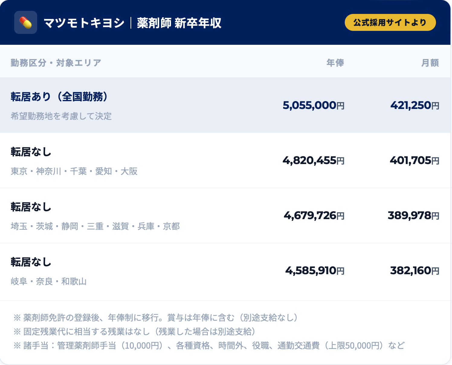 新卒の時から年俸5,055,000円(転居あり)とドラッグストアでも高水準で、ウエルシアやツルハドラッグと比較しても遜色ない水準です。